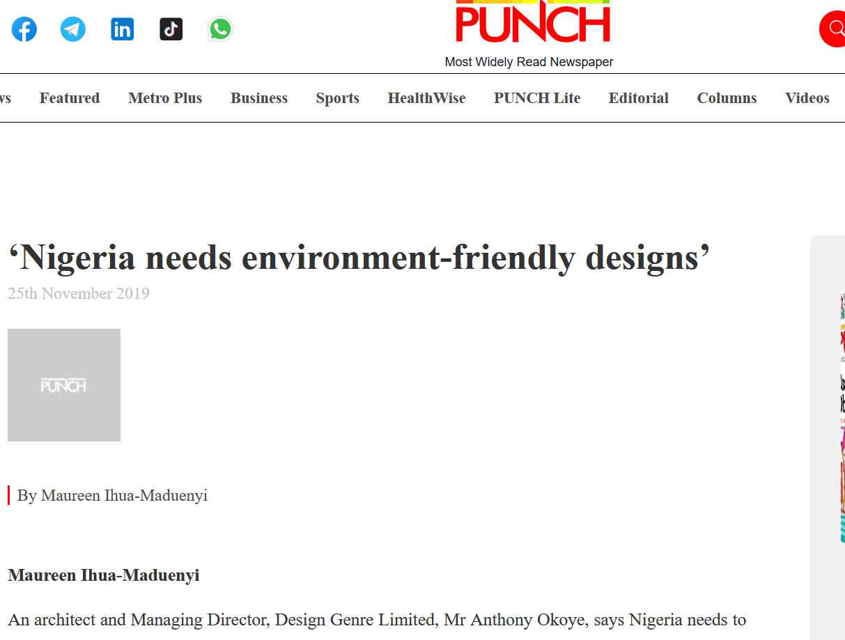 An architect and Managing Director, Design Genre Limited, Mr Anthony Okoye, says Nigeria needs to adopt sustainable and environment-friendly designs across its cities to reduce the negative impact of buildings on the environment.